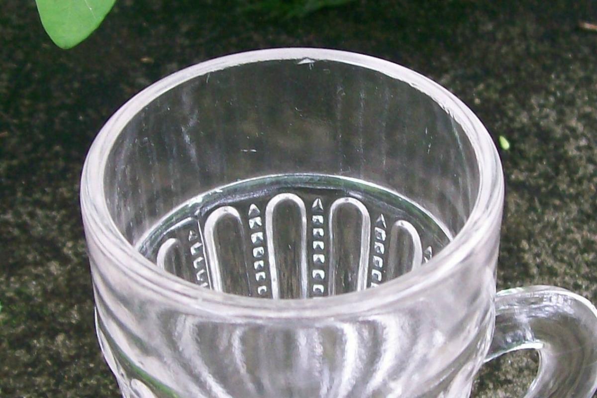 Early American pressed glass mug in the "Beaded Coarse Bars" pattern #22, made by the Indiana Tumbler & Goblet Co., circa 1894-1899. Measures 3 3/8"h. Small flakes to upper rim, inside as shown. Sold as is. Have 2, priced separately, but happy to combine shipping: contact me before ordering. Inglenook Antiques...Established 1989.