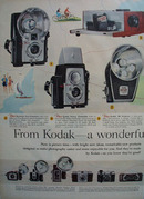 Eastman Kodak New World Picture taking Ad 1957 This is a April 15, 1957 advertisement. It is a nice color two page ad. Shows many styles of Kodak Cameras and it reads, From Kodak, A wonderful new world of picture taking. In mint condition. Photo is taken through plastic and may show wrinkles or crookedness that is not in the ad. This original magazine tear sheet measures 9 3/4 inches wide by 14 inches tall.