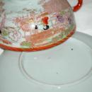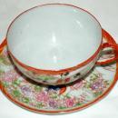 The condition is very good. Some paint wear to the underside of the handle and a speck on the rim There are no chips or cracks. The saucer is in exceptional condition.