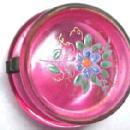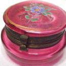 This Cranberry glass patch box has enameled flowers (blue with green leaves) on the top. This is a box where the victorian lady kept her beauty marks. The hinged brass mount is in excellent condition with the clasp working well. No additions or repairs. Buyer pays S.+ H. "We accept Visa, MasterCard, Discover and American Express via Paypal, or payment with a money order or check. We will ship within 24 hours if paid with a money order or Paypal. Payment with a check will delay shipping."
