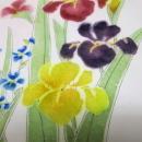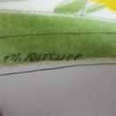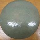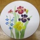 This is a nice vintage enamelware 8.5" diameter plate signed M. Radcliff near the edge. It is enamel over copper. It has a textured green color enamel on the back, and a floral pattern with off-white background on the front. Some wear from use or storage on the enamel, but overall is attractive in appearance, no damage.