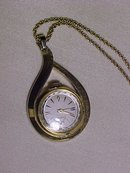 Graceful Tear Drop shaped pendent Watch. The brand name is Endura and it is Swiss Made. This is a vintage manual wind that works excellently. The inside of the bezel has a beveled crystal that sparkles. The design of that the watch sets in is of a smooth goldtone finish on one side and the other side it is textured. The pendant is 2" long. The entire drop length of the chain with the pendent is 14".