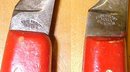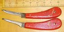 Offering these two horse hoof trimming knives for one money. They are both marked by the maker "ERIK FROST MORA SWEDEN" a knife/tool maker that has been in business for well over a hundred years, offering fine quality edge tools and knives. These two knives are in good++ used condition with good sharp edges along the length, and at the tip also. They are used but with very little wear, well maintained. Both are 8.2" long overall, both have red painted handles with some wear, and a hang hole in each one. The sharpened part of the blade is about 3" long, sharp and ready to use.