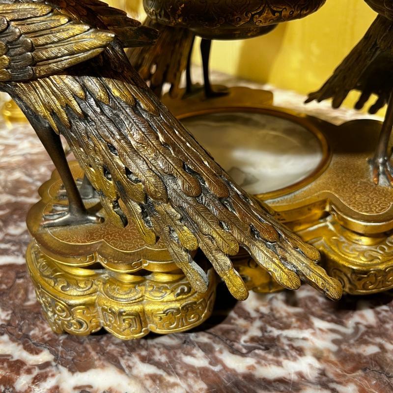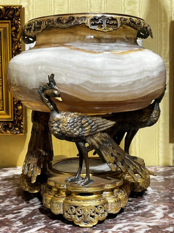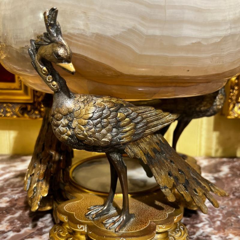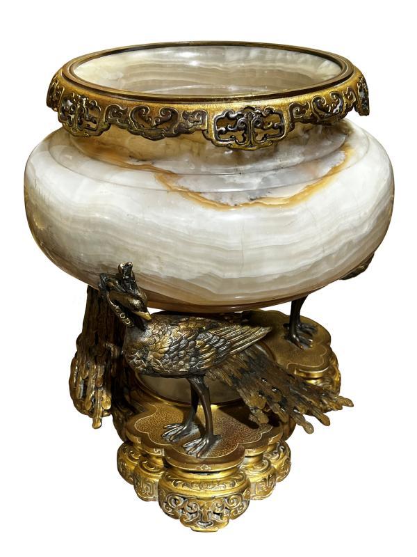 Our gilt and patinated bronze and onyx centerpiece bowl in the Japonisme style is attributed to Eugène Cornu of Paris, circa 1870. 14 3/4 inches tall and 13 inches in diameter. The onyx bowl is surmounted by a reticulated rim with stylized cloud motif and supported by three phoenix birds encircling an onyx disk and base with repeating cloud motif at the feet.