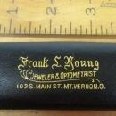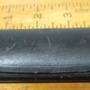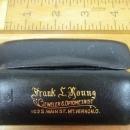 This is a very nice vintage eyeglasses or spectacle hard case with spring loaded to close feature. It is marked by the original optometrist in gold lettering "FRANK YOUNG JEWELER & OPTOMETRIST 102 S. MAIN ST. MT. VERNON O." and is also marked near that name with a patent date "PAT NOV.18.07" with a stamp pressed into the black leather. It appears that the interior compartment with hold a set up to about 3.8" long x 1.1" wide. The felt inside is also in good shape, purple in color, very strong spring hidden that keeps the lid closed.