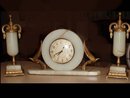 This is one neat genuine deco clock that has gilt birds on each side ( bronze or brass I think) and they are set in this heavy marble base. The set probably weighs about 40 pounds and it is really gorgeous. The sconces have the very Greek designs that you see in museum statues and they measure 13" tall and 4" wide. The clock is 16" long and 9 ½" tall. It is electric ( I guarantee this is OLD) and it runs great. The back has this written: manufactured under pats 1719808797912 re_177990 Other pats . Made in USA 11-5 b-60 Cycle 2w. The knobs have a start button, set time button and a note on eh back when the current interrupts the clock will stop so you need to reset it. . This is just such a great set and made of real fine marble. This is in great shape . IT looks to me to be all original too. The bottom base had a crack and was professionally repaired and it is as sturdy as when it was first made. ( see photo) . This is sold as is ( working of course) This will require insurance. approx shipping is about $50.00 thru fed ex. IF it is more I will let you know, if less I will refund the difference if you pay the $50.00.