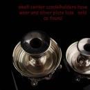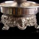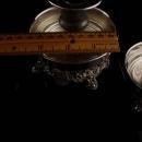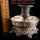 Both of these have art nouveau figural womens heads on the bottom in relief. Portable and beautiful, they are really ornate pieces. Small enough for a nightstand these have a drip tray so the candle wax does not get on the nightstand. Both are marked Sheridan silver plate. There is silver wear ( they look gray) to the smaller candle holders in the center. The bottoms still have plenty of shine to them. They are so unique that once you put a vintage candle in them and let is burn it will create quite the haunting effect.