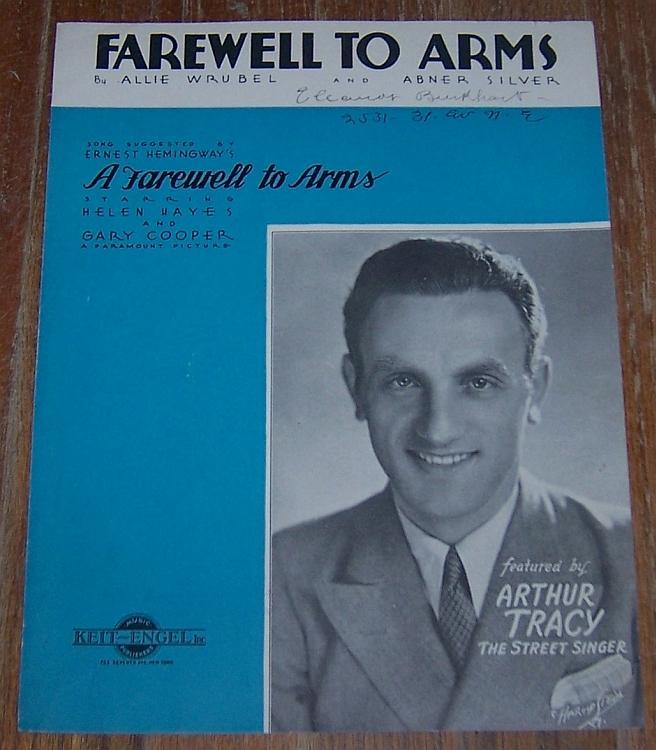 Farewell to Arms Starring Helen Hayes and Gary Cooper. Song Suggested by Ernest Hemingway's Novel by Allie Wrubel and Abner Silver. 1933 Keit-Engel. Sheet Music is in good condition, wear at edges, previous owner's name on front
