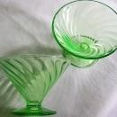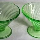 Federal Glass Company's "Diana" pattern sherbets. Marked with "F" in shield, on bottom center. 1937-41. Depression green with uranium glow, and very attractive swirl design. Each measures 2.75"h x 4"d. No chips or cracks, just a few mold marks and striae ("straw" marks) where the glass cooled. Sold as a pair. Inglenook Antiques...Established 1989.