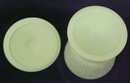 Offering this wonderful vintage Fenton Art Glass footed covered compote bowl, made in luminescent lime green custard glass. Beautiful raised pattern called Wild Strawberry. Measures 9 inches tall x 6 inches diameter, good+ condition, no cracks; exception is one small flake chip on underside of lid. Made by Fenton Art Glass Co, circa 1970's. Enjoy as is; use in pastel Christmas decorations, perfect for the spring!