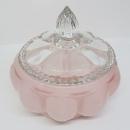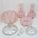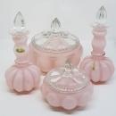 Fenton Rose Overlay Silver Set includes a 6" covered trinket/candy dish, a 4.25" round puff box with lid, and 2 small 5.75 bottles with stoppers which make them 7.25" tall. Both bottles have an oval yellow sticker with "HAND MADE IN AMERICA By Fenton." All pieces are in new condition. Fenton made this pattern from 1943-1948. Postage via USPS Priority Mail Insured in the US in approximately $17.50, depending on your zip code.