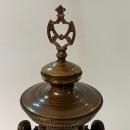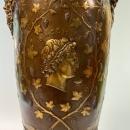 Our tripod bronze vase in the Roman style by Ferdinand Levillian (1837-1905) features a Roman scene on one side and the face of Bacchus on other side. It has a lovely warm brown patina with gilt highlights. 33 1/8 inches tall and 8 inches across. It dates from the 1880s to 1900s and was drilled for use as a lamp. Finial at top may be replaced with lamp hardware.