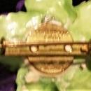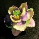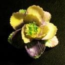 Ceramic flower pin, marked "Coalbrook China/ Made in England". Circa 1960's. Measures 1.5"d. Hand painted: purple, pink, yellow & green. Has one small flake from the bottom side of a leaf, as shown on the left side of the last photograph. Sold as is. Inglenook Antiques...Established 1989.