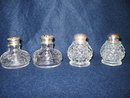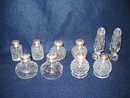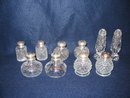 HERE IS A NICE COLLECTION OF SALT AND PEPPER SETS FEATURING 3 SETS OF CUT GLASS, ONE BLOWN AND ONE HOBNAIL. THERE ARE TWO IMAGES WHICH HAVE THEM SEPERATED INTO CUT/OTHER. THE TOPS ARE ALL STERLING EXCEPT ONE SET. THAT SET (THE TALL ONE) IS MADE OF EXCEPTIONALLY DEEP CUT CRYSTAL. THE IMAGES ARE DISTORTED BY THE CAMERA FLASH WHICH GIVES A COPPER TINGE THAT IS NOT PRESENT. THERE ONE FLICK ON ONE OF THE PIECES BUT OTHERWISE THEY ARE OVERALL IN GOOD CONDITION. HEIGHTS VARY FROM 2.5" TO 4.25".
