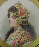 The beauty pictured on this flue appears to be dressed in the exotic garb of some far Eastern country. Her dark, thick, curly hair is bursting out from underneath her bejeweled headdress. Her image lies on a nearly white background with just the slightest shading of blue and she is matted within two circles of gold. The metal frame is in good shape (7 ? diameter) and the piece hangs easily and safely on the wall. Please contact us for shipping information, & let us know your shipping address. This item is subject to prior sale. $95. (Item #flue 5)