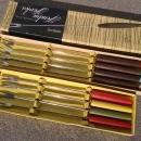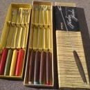 2 Sets Fondue cocktail utensil forks with original cardboard gift box. Walnut & painted wood handles with color tips and colorful paint. Japan made stainless steel mark.