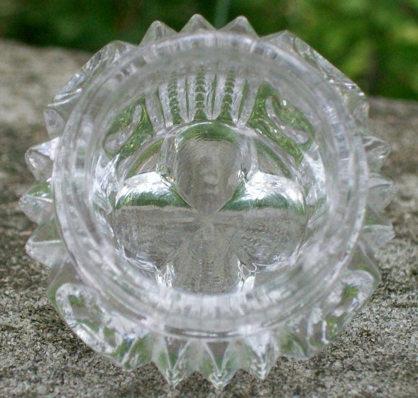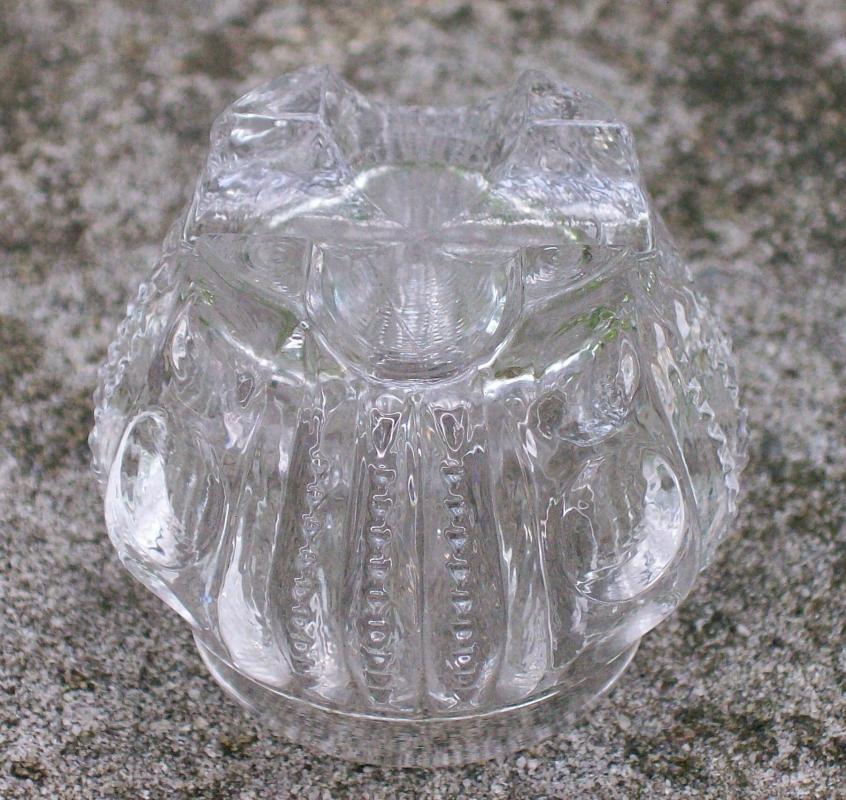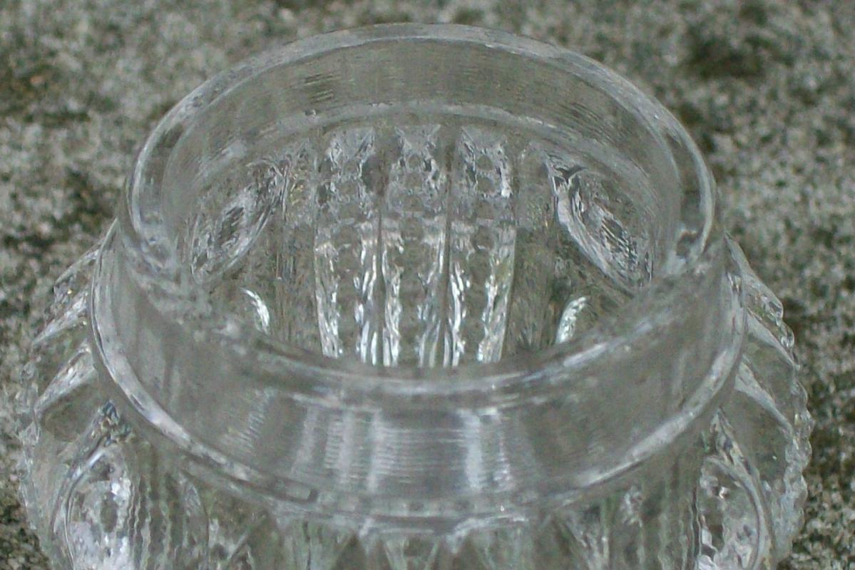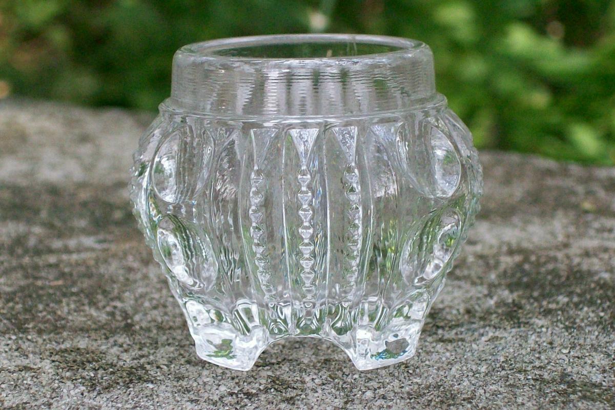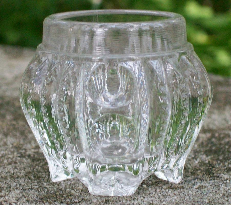 Fostoria glass round rouge box #718, ca. 1900. Pressed zipper and thumbprint pattern with 4 small feet. Clear glass. Measures 1.5"h x 1.75"d. NO LID. No chips or cracks. Sold as is. Inglenook Antiques..Established 1989.