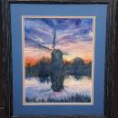 Framed Painting of Holland Windmills by Oregon Artist Kathy Pugh. It is framed behind glass and the frame is 17" x 20".