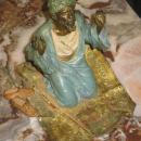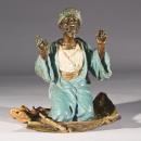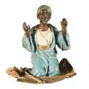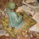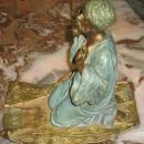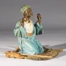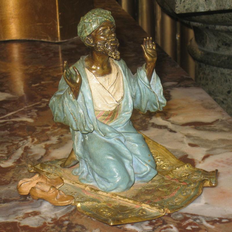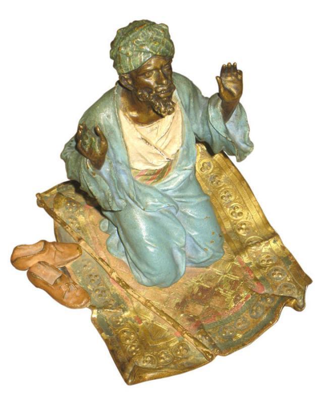 This cold-painted bronze figurine from Franz Bergman depicts an Arab gentleman praying while kneeling on a prayer rug, with walking stick and shoes to his side. Height: 5 in; 12.7 cm. Marked GESCHUTZT with style number 2082 on underside, and on his robes on his left side near the rug. This model is shown in plate 4805 in volume 4 of Bronzes: Sculptors and Founders, 1800-1930, edited by Harold Berman.