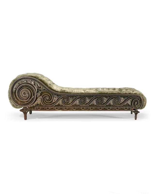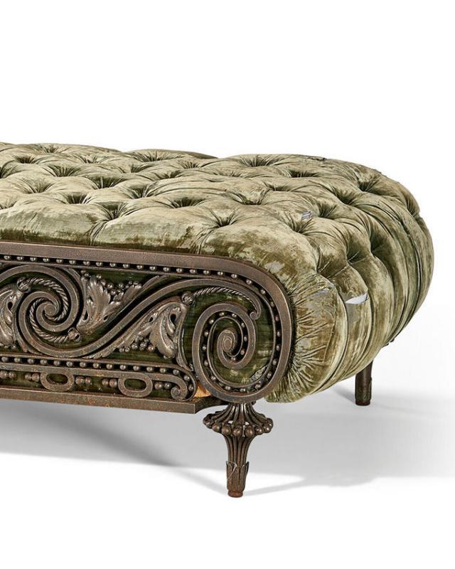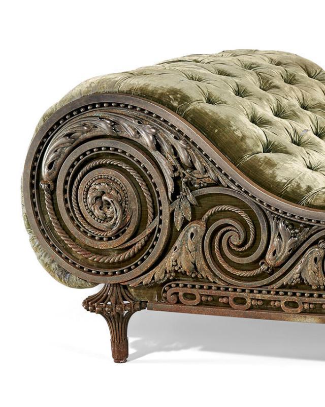 Our client's impressive French Art Deco period chaise lounge features a steel and wrought iron frame with Vitruvian scrolls raised on toupie feet with old (possibly original) button tufted green velvet upholstery. From an important estate.