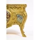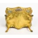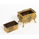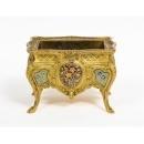 A French ormolu, bronze and Champlevé cloisonné enamel jardiniere centerpiece, in the form of a commode, circa 1880. Beautiful quality ormolu and enamel, with original liner. Can be used as a planter, cachepot, centerpiece, or jardiniere. Measures: 4" high x 5.5" wide x 4" deep. Excellent condition, ready to place.