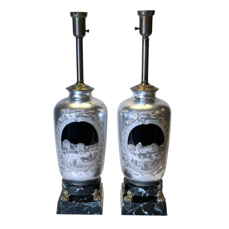 Our beautiful vintage table lamps dating from the 1940s or 1950s feature exceptional reverse painted and silver-gilt glass vases depicting the entrance to the Chateau de Versailles in the grisaille style. With faux marble painted wooden pedestals.