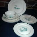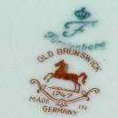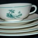 RARE PATTERN Furstenberg Brunswick Germany Porcelain Cream Soup & Saucer Set with Salad Plate, Bread and Desert Plate and 10" Dinner plate. . Each piece is hand painted with a lovely county landscape scene. It is green on ivory colored porcelain with a green stripe around the rim. The patterns are charming and simple. The quaint country scenes vary. Some have mountains, lake and sail boat and then others have a house on a hill near a stream with a picket fence and some have lake with mountains in the background and the picket fence in the foreground. Some are marked Furtstenberg German with an F. Others are marked Furtstenberg Old Brunswick Made in Germany with a Horse and numbered 1747. The condition is very good to excellent. I selling them in 6 piece groupings however I have 8 sets of the same. Here is what you get!