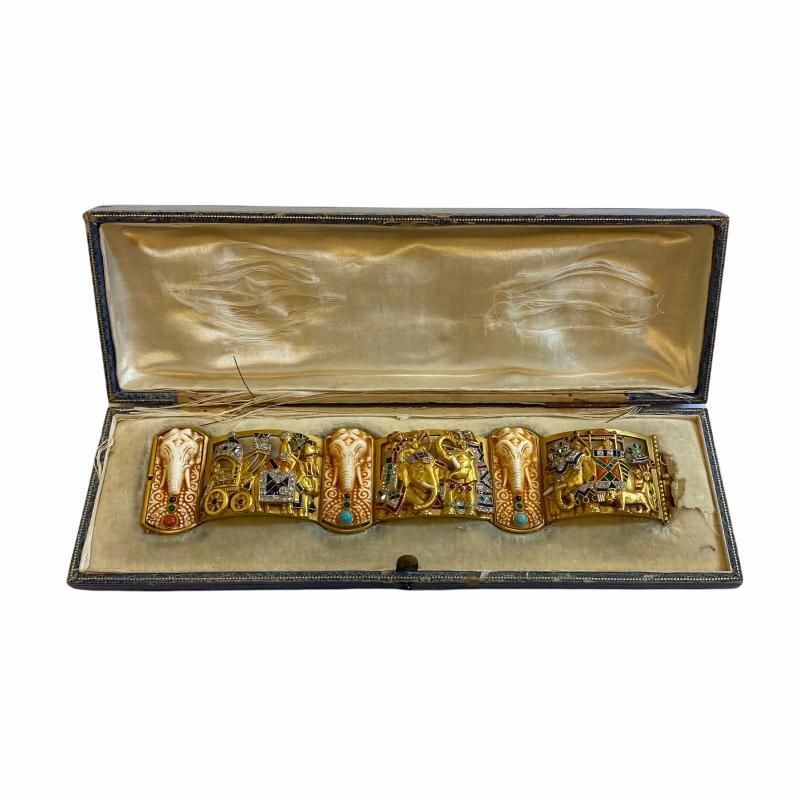 Our magnificent 18K gold, gem-set and diamond bracelet, attributed to the legendary Barcelona jewellers, Fuset y Grau, circa 1930, features a ceremonial Indian procession of elephants, exotic animals, royalty in carriage. It has three chased gold openwork panels decorated with a variety of calibre-cut colored stones, including sapphires, rubies, emeralds, cora, turquoise and onyx, plus small round diamonds, divided by three elephant heads carved from bone, and studded with colored stone cabochons at the base. 1 3/4 in (4.4 cm) wide and 7 3/4 in (19.7 cm) long . In its original gift box measuring 9.75 by 3 by 1 in (24.8 by 7.6 by 2.5 cm).