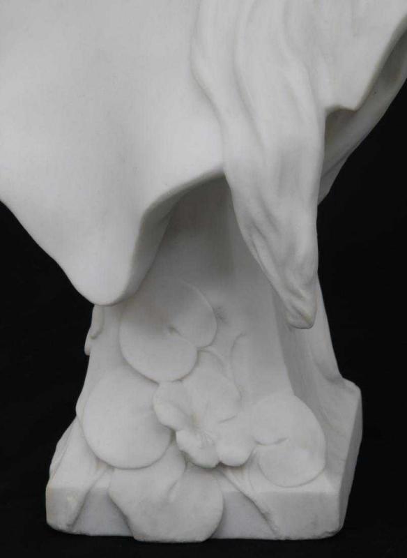 This marble bust by Georges Charles Coudray (French, 1863-c.1932), entitled Les Nenuphars (The Water Lillies), depicts a lovely female with water lily flowers in her hair and base decorated with lily pads. Good condition with a chip to one of the flower petals on base. 25 x 10 x 14 inches. Weighs over 90 lbs.