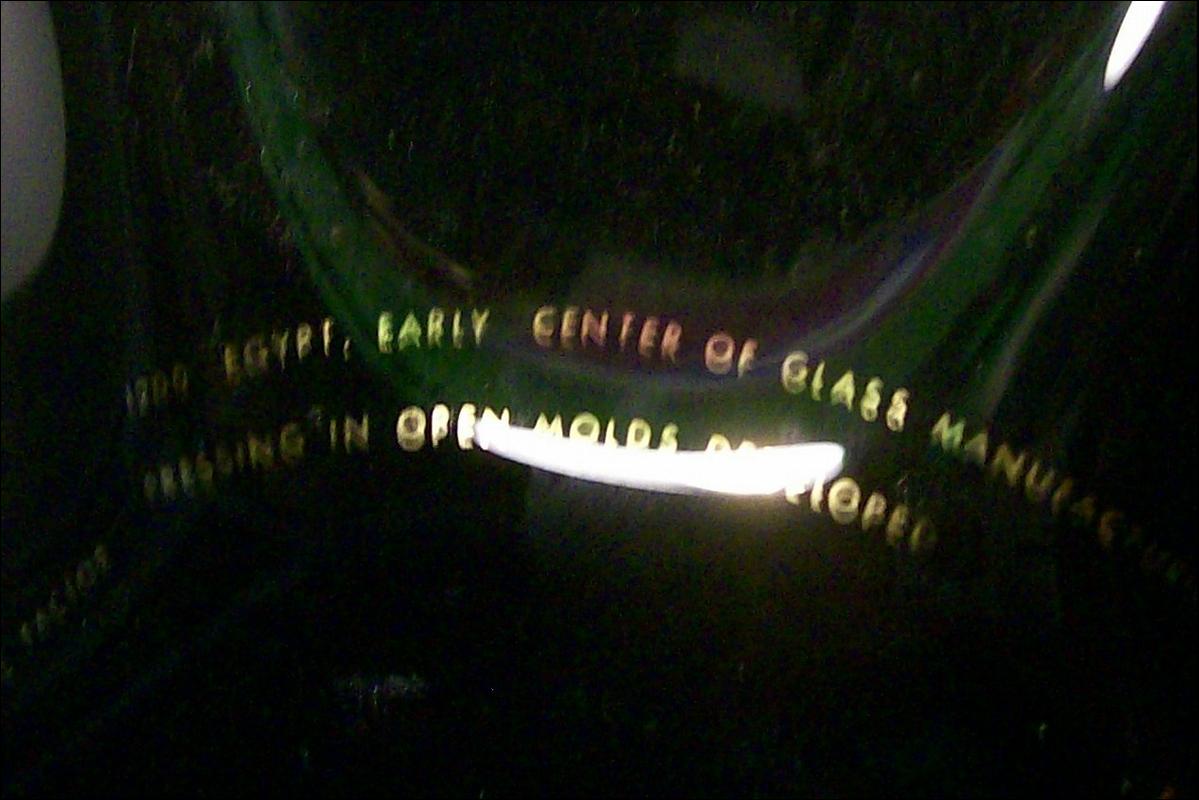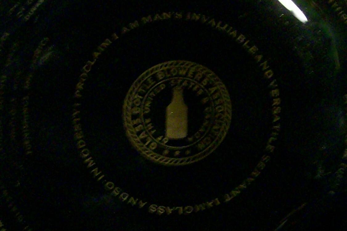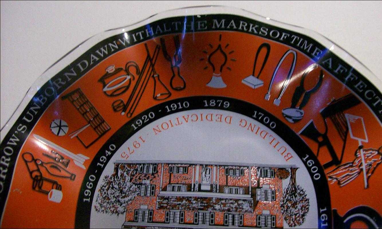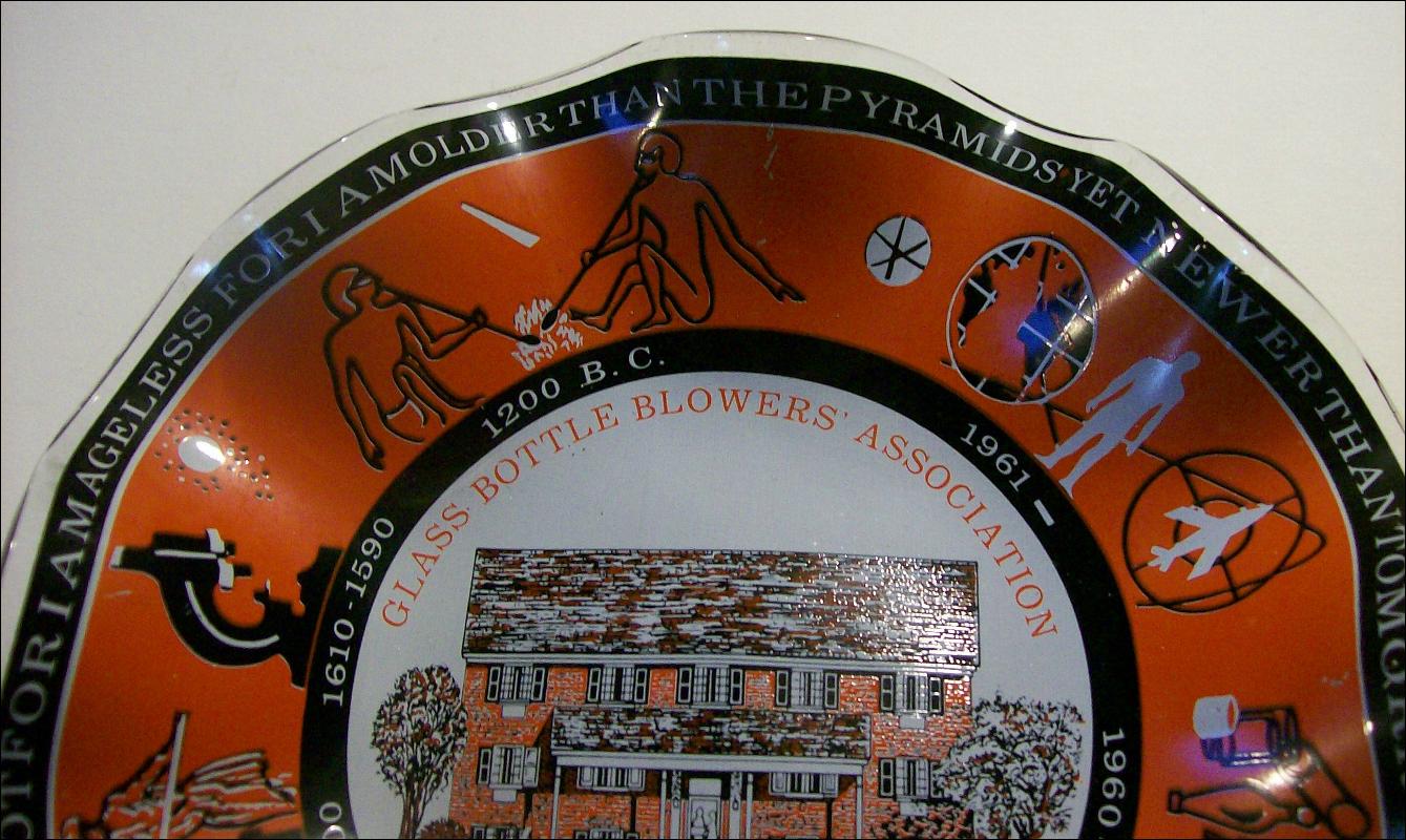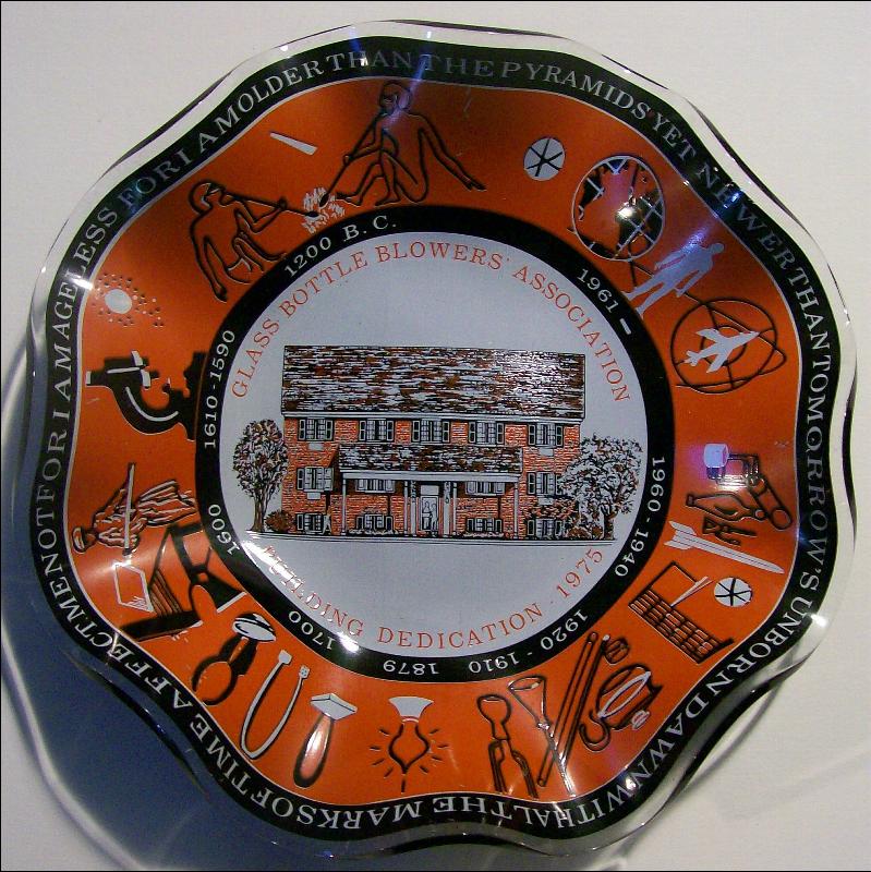 Commemorative ruffled dish from the Glass Bottle Blowers Association, celebrating the dedication of the building in 1975. Measures 7.5"d. Back is stamped with dates and historical information on glass blowing, that corresponds to the pictures on the topside of the dish. There are a few small abrasions to the red-orange paint on the topside. Flint Glass Workers Union backstamp. No chips or cracks. Inglenook Antiques...Established 1989.