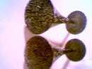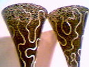 Really Cool!!! These have been handpainted, artist unknown. The whole surface looks like it has been "spatter" painted with the black. Then the white "squigels" have been added over that. The white is slightly raised. The inside surface of the glass is unpainted. They are aprox. 5 3/4" tall X2 5/8" from edge to edge of rim. The shipping fees quoted are for priority/No insurance in USA.
