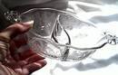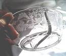 A really lovely small divied bowl with an etched floral design all around it. The handles are the fancy kind often used on Cambridge but can not find this pattern anywhere. It has a manufacture flaw in the bottom, does not effect the use of the bowl. There is a deep scratch in one end. It actualy looks like it was cut by the tool that etched the design. It measures approx. 8 7/8" handle tip to handle tip by 5" wide and approx. 2 1/4" deep. The fee quoted for shipping is for priority/Insured in USA.