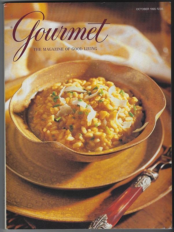 Gourmet Magazine October 1995. Butternut Squash Risotto On Cover. Articles inside include Berks County, PA, The Canary Islands, Thai, Polenta, Pommes Anna, Halloween Dinner, and more. Filled with great illustrations and advertising. Magazine is in good condition, wear at edges.