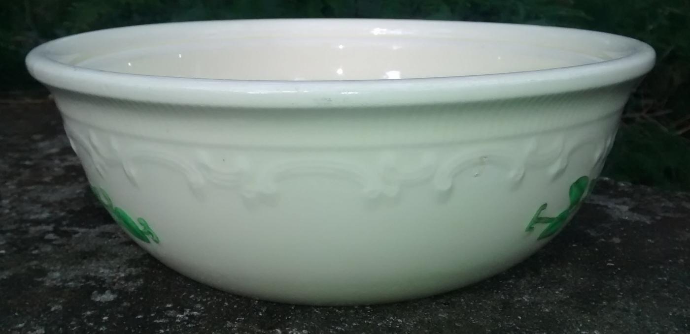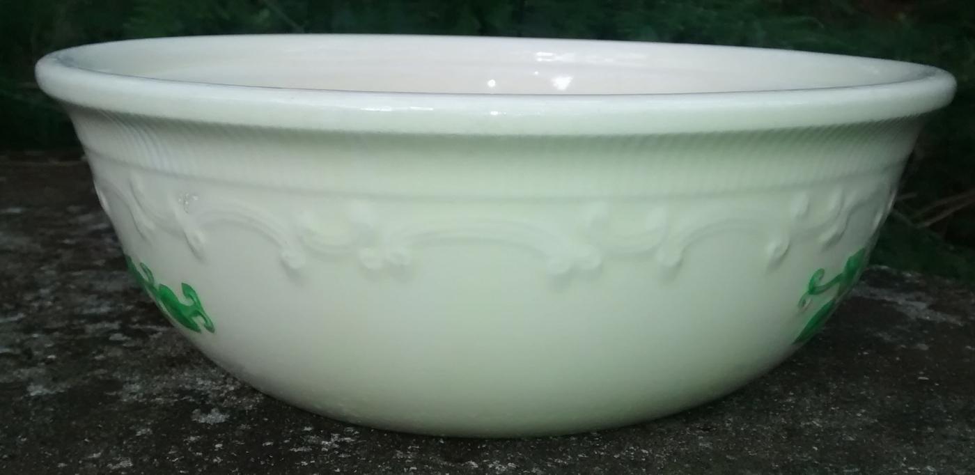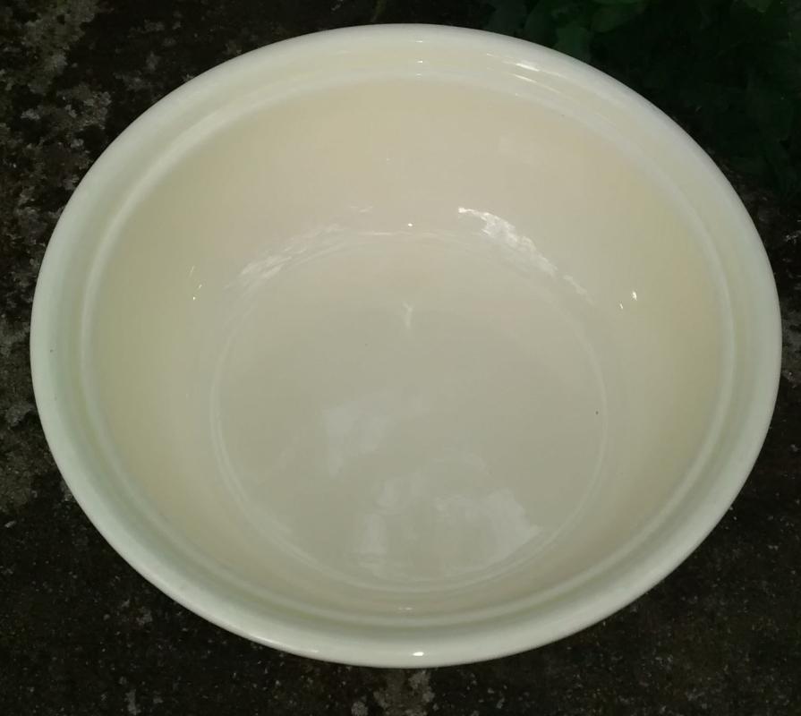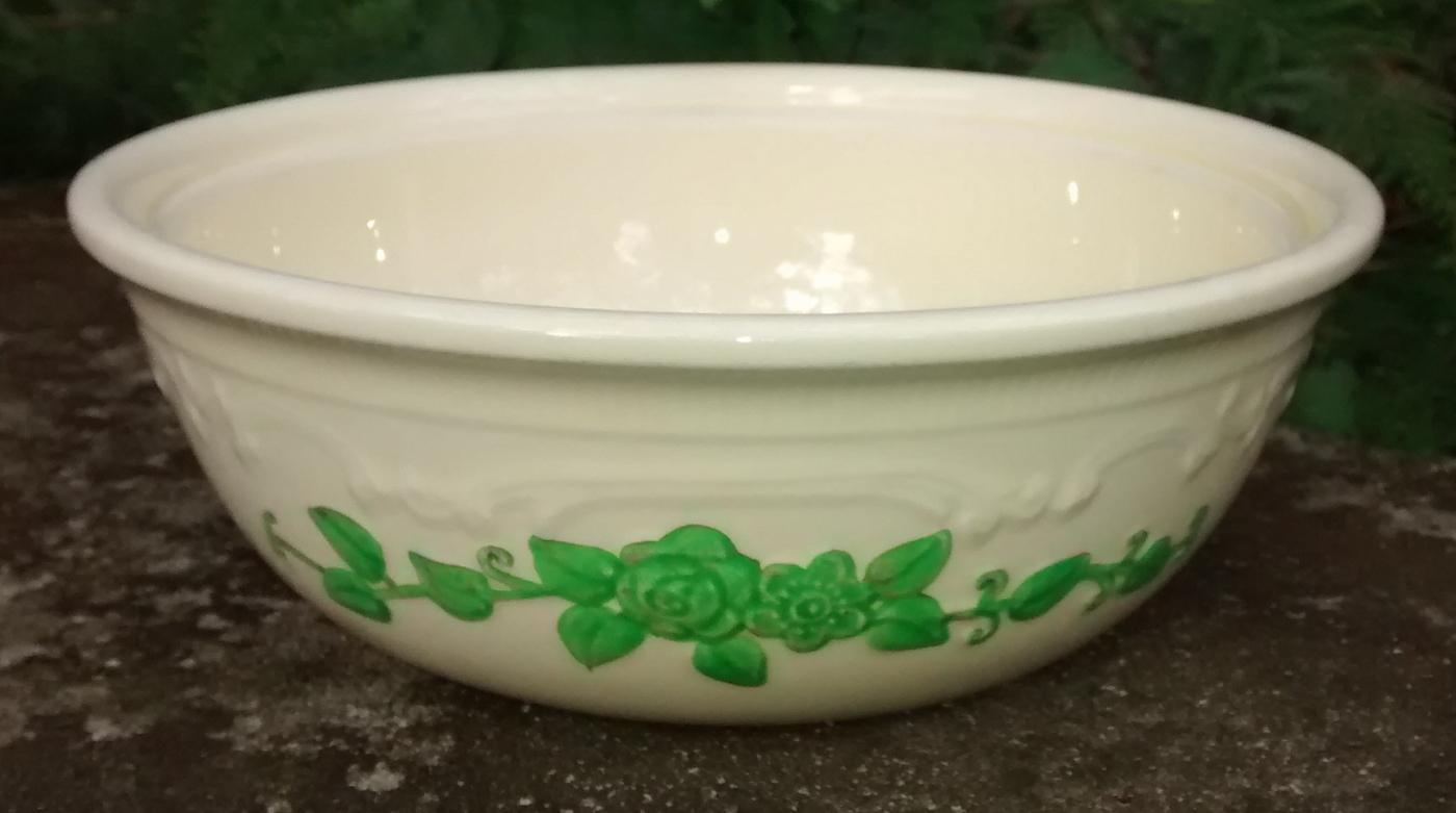 Homer Laughlin "Embossed" Oven-Serve casserole bottom in cream with green hand-painted accents. Dates from the 1930s. One quart size, measures 8 5/8"d x 3"h. Sorry, no lid. Nice condition with no chips or cracks. Have 2, priced separately, but happy to combine shipping. Just contact me before ordering. Inglenook Antiques...Established 1989.