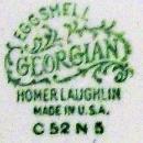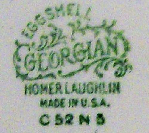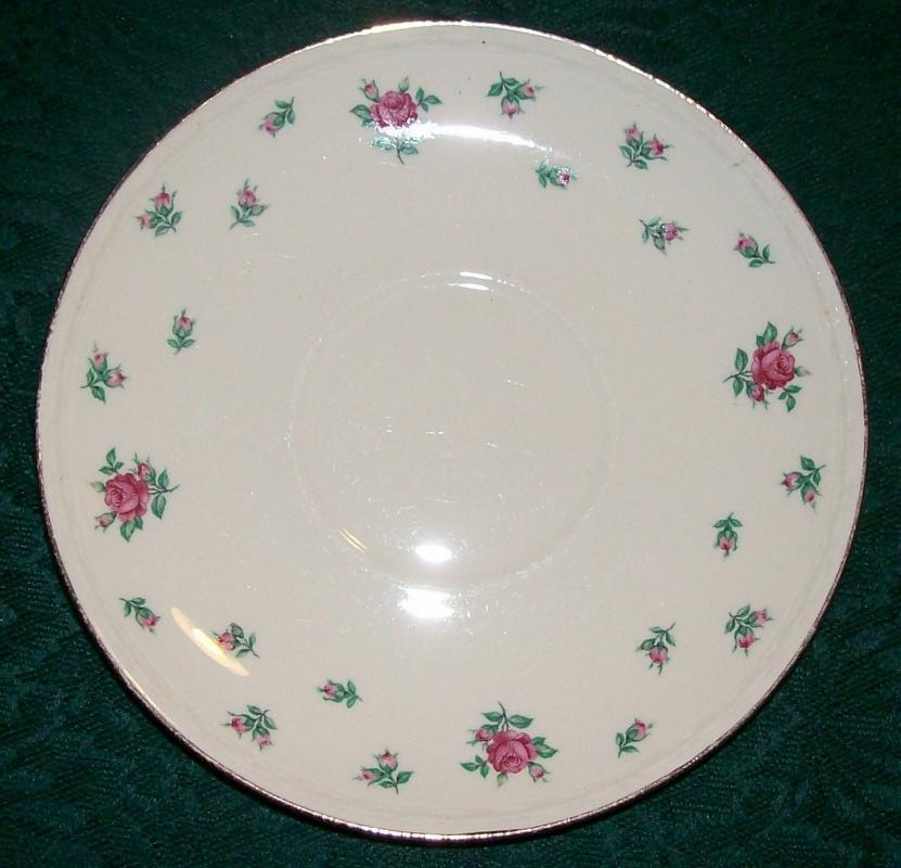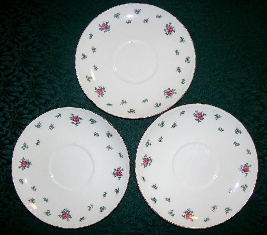 "Rambler Rose" pattern saucers, VM2. Made by Homer Laughlin on the Georgian Eggshell blank. Each measures 6"d. No chips or cracks, light wear as shown . Circa 1952 (see mark). Sold as a set of 3. Inglenook Antiques...Estabished 1989.