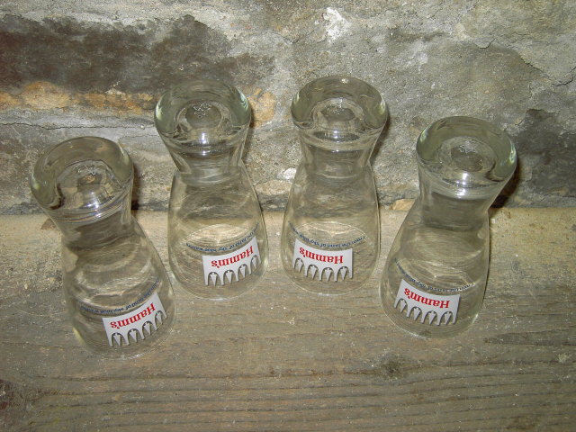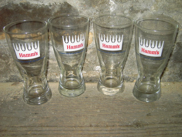 HAMM'S From The Land Of Sky Blue Waters Beer glass tumbler set of 4. 1960's to 1970's Retro era bar & cocktail glasses-new condition, never held a brewsky. Stored for decades in original Libbey Owens Illinois Toledo Ohio factory box. White Star ink stamp bottom markings.