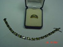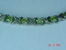 Vintage sterling and peridot tennis bracelet and matching size 6-1/2 ring signed HAN 925 THAI. The bracelet has sterling "X's" and peridot stones representing hugs and kisses. The bridge under the stone on the ring needs to be reinforced. The bracelet is 7-1/4" long with a box clasp and safety arms, and is in excellent condition.