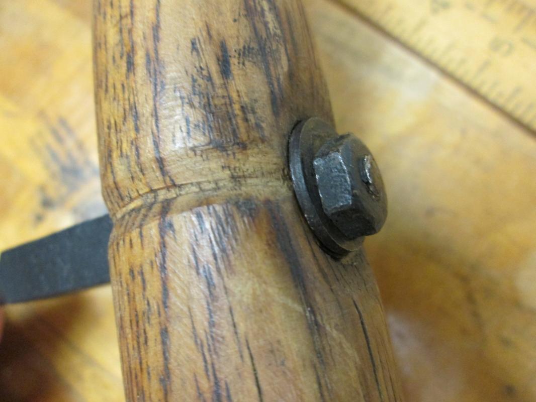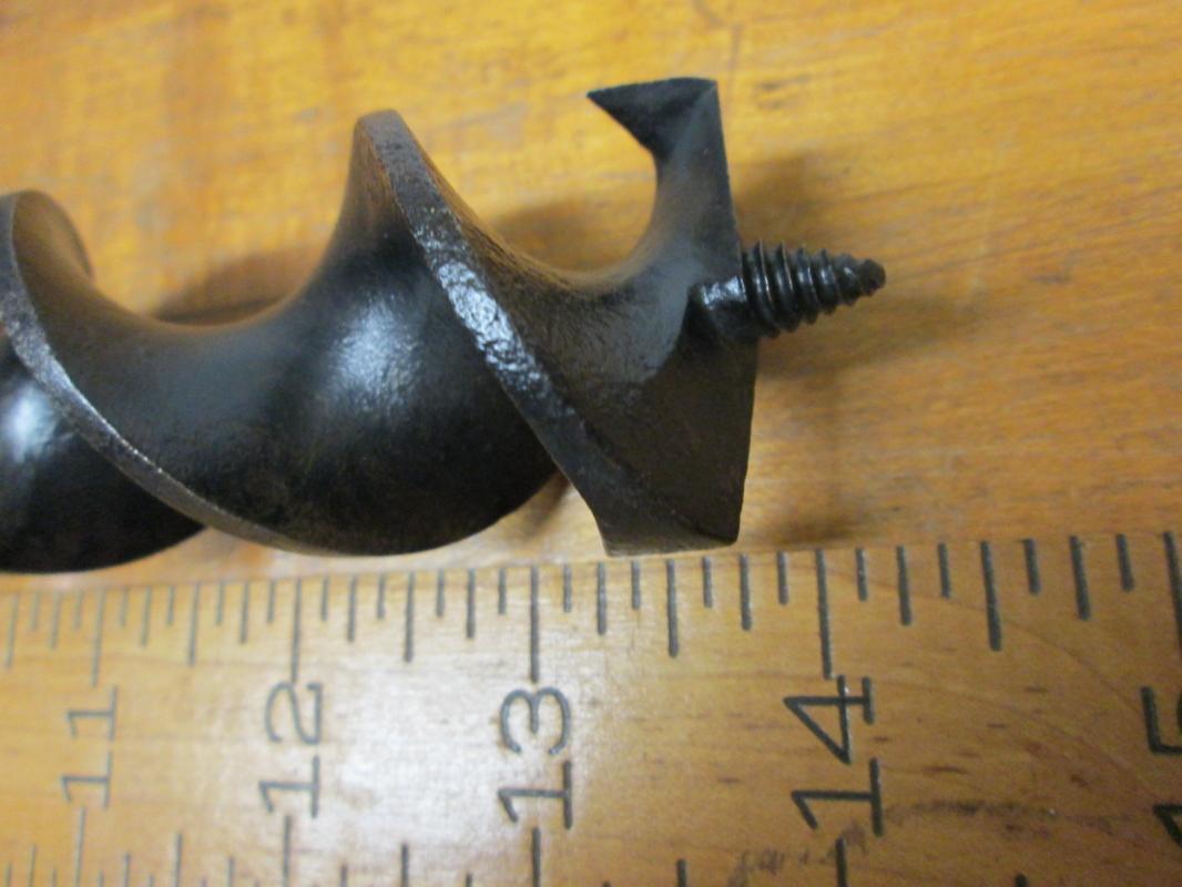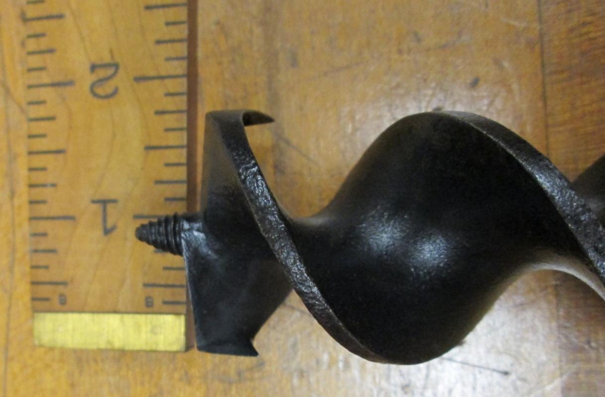 This is a good clean auger bit w/hardwood T-handle. It is 16" long overall, and 1.5" diameter. The auger bit is not marked by the maker but is in the James Swan design with double cutting edges, double spurs. The auger is double cutting edge, double spur with very smooth polished spiral surfaces. The center lead screw is in very good condition. We note some minor pitting on the spiral, but overall in good shape. The auger bit has a threaded end nut that holds the bit securely in place when attached to the handle. In this case a square nut is used along with a washer for the proper pressure to hold the handle firmly in place. The auger bit has a .426" diameter main shaft. The handle is also in good solid condition, no damage, no cracks, some light wear and minor dings, very strong and solid. The handle is 14.5" long and is fairly easy to remove from the auger bit, for easier storage.