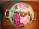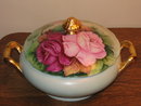 HERE IS A STUNNINGLY BEAUTIFUL HAND PAINTED ARTIST SIGNED COVERED BOWL WITH GORGEOUS PINK AND CRANBERRY ROSES. THE ARTWORK ON THE ROSES OF THIS PIECE IS SUPERB. THE LOWER PART OF THE BOWL IS A CREAMY LIGHT GREEN COLOR AND THERE IS HEAVY GOLD GILDING ON THE HANDLES AND FINIAL AS CAN BE SEEN IN THE IMAGES. EXCELLENT CONDITION WITH NO CHIPS CRACKS HAIRLINES OR REPAIRS AND NO GOLD WEAR! ARTIST IS C. DURFLINGER. MEASURES 6.5" TO FINIAL AND 10.5" HANDLE TO HANDLE.