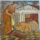 Entirely hand-painted overglaze picture tile from the series designed by Walter Crane, "A Baby's Opera", c. 1880-1890. Here is "There was a lady loved a swine." in bold and bright glaze colors on a Webbs Worcester Tileries blank. This is an interesting tile which I attribute to have been painted at Doulton & Co. based upon the quality and freeness of the decoration and the following statement in Austwick at p. 82: "...Doulton also had a flourishing trade in hand-painted tile panels which were used in a multitude of buildings from schools to underground railways. From about 1890 JH McLennan, John Eyre, Esther Lewis, William Rowe and Margaret Thompson designed and painted the vast majority....William Rowe and Margaret Thompson are noted for the nursery-rhyme panels which were used in children's hospital wards all over the world...all its other dust-pressed tiles can be identified as having being made by Webbs, Craven Dunnill and Mintons China Works."
