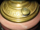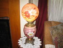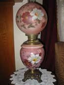 Here is a gorgeous antique hand painted "Gone with the Wind" parlor lamp by the Edward Miller Company. The quality of the painting is excellent as can be seen in the images. It features cranberry and white flowers against a pink background. The lamp has been electrified with a three way switch (top, bottom, both). It measures 25" to the top of the globe which is 9" in diameter. No chips or cracks.