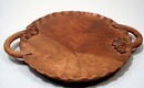 Handcarved ornate plate, Look at the beauty on this hand carved plate with floral tree type handles, It also has a etched design floral center with lines coming out of the center. There are 2 wooden feet. The wood has a burl effect, and is 2 colors. Very attractive. 10" plate with another 2" in handles