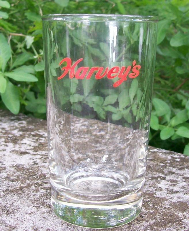 Harvey's Lake Tahoe Hotel/Inn/Casino glass advertising tumbler. Clear with red logo, dates from the 1960's. Measures 4 3/8"h; made by Libbey Glass. Nice condition with no chips or cracks. Inglenook Antiques...Established 1989.