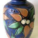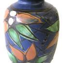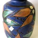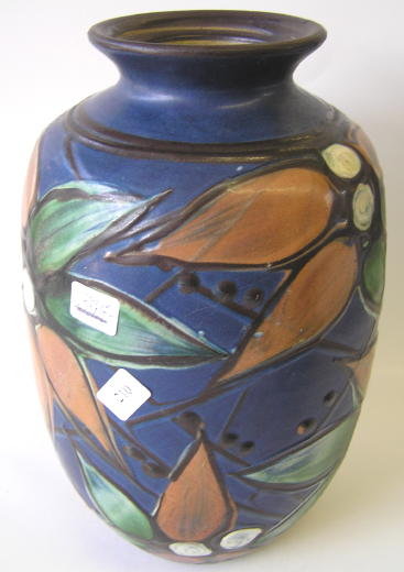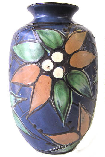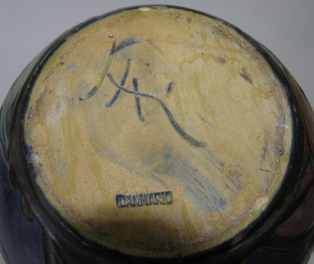 This lovely old Danish ceramic vase, designed by Herman Kahler, measures 10.5" high by 6" in diameter and weighs 3 lbs. 9 oz. Impressed mark "DANMARK" and hand-inscribed mark " H K ".