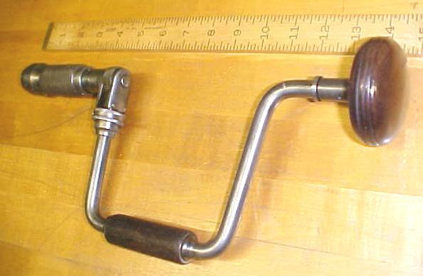 This is a unique, and rare patented 10" swing ratchet brace marked "THE HOLT MFG. CO. HARTFORD CONN. PAT. FEB.16.92" on the chuck sleeve. It is also marked "NO. 10" on one swing arm. One of the more unique features on this 1890's patent is the ratchet system that offers about twice the amount of ratchet click positions as any other brace from this era! A very fine movement of the ratchet, works very smoothly, very nicely design and machined! The crank handle has brass sleeves at each end that helps it turn smoother and less possiblity of wear. The end handle is very nice, the flange is double bushing design for very smooth and snug operation. The chuck is a heavy duty spring loaded two jaw chuck with a sleeve adjustment. Overall in very good working condition, no rust or damage, one minor ding in the knurled sleeve, otherwise some minor pitting noted, very clean and ready to use condition. The brace is about 14.5" long with a 10" sweep.