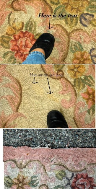 Antique hand hooked wool area. It is approx 106" x 66". The condition is good. There are 2 small wear spots and 1 small tear. Plus there is an 4 " area along the border that is a bit shaggy. I have lightly cleaned the rug with mild detergent and water. However I must have missed two light yellowish spots I don't know if it is spilled coffee stains or what. I did not notice them until I was snapping pictures. The rug is is a valuable enough to invest in having it professionally restored but it is in decent enough condition to use.