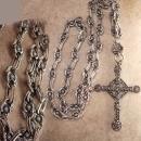 The photos of this remarkable marcasite cross don't do it justice. The gunmetal cross is quite large ( 4 1/2" long including the hanger) and it is loaded with marcasites that catch the light. The heavy ornate 1/2" wide chain has nouveau style floral links. The beauty of this cross is heartwarming and spiritual and much prettier in person.