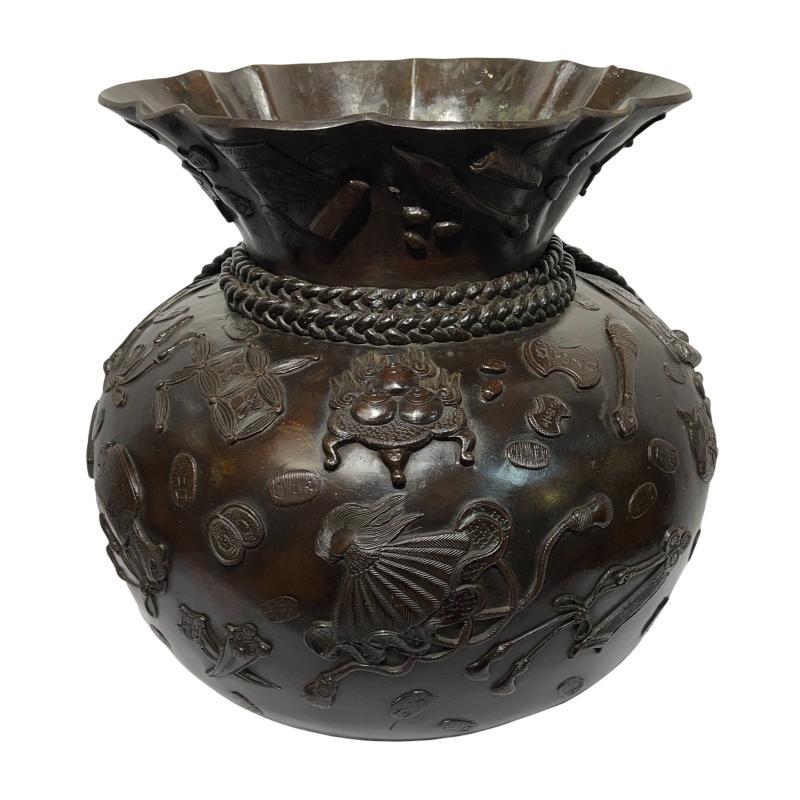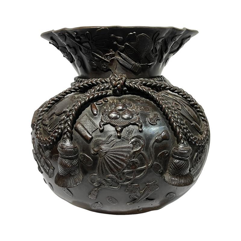 Our large Japanese patinated bronze vase appears in the form of Hotei's sack (or possibly the sack of Daikokuten) features wonderful designs in relief including censors, musical instruments, and other treasures and plus inscriptions of wishes from the God of Happiness, tied at the neck with tassled cords. Apparently unsigned. Approximately 16 by 16 by 16 inches. The largest and finest example of its kind we have seen in our 20 years in business.