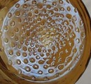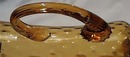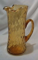 Inverted thumbnail amber cocktail pitcher. Very unique shape for an inverted pattern, but it makes sense if you are going to mix something such as cocktails, that with a pattern on the inside, the swirling action would be much more complete. The handle is applied & has a swirl pattern to it. The lip comes almost to a point to keep ice from coming out. I have no idea of the age on this but would guess the 1950-1960 era. The bottom has a dotted almost a mum pattern. The glass has no chips et, but has several flaws, a couple of tiny bubbles, a crease on the side that looks like a 2" scratch, none of these are seen without close looking!! Great pitcher!! 8 x 3" not including handle. There is no mark of manufacturer but it looks like a piece of Fenton or Imperial glass.