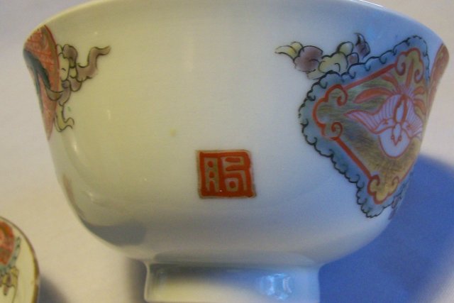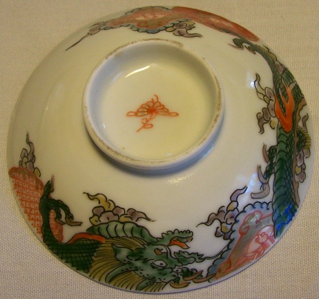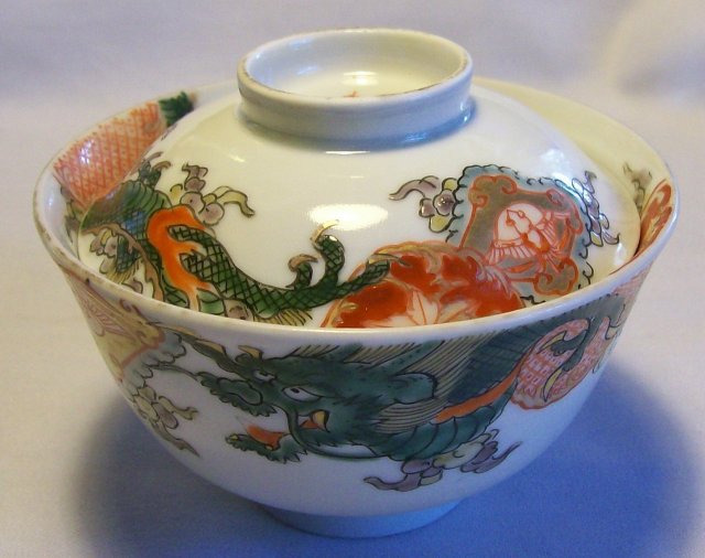 Set of 4 covered rice bowls from Japan with green, undulating dragons, inside and outside of the bowls and lids. Circa 1900, marked with crimson red and gold character mark on side of bowl, believed to be from an Arita (Imari) maker. Flower mark on lid. Each bowl measures 4.25"d, with cover stands 3.25"h. All pieces have some wear to the inside bottom and the gold trim, as these were intended to be used. The standing foot rim of one bowl has a "bruise" type crack that has not broken out. Email for further details and photos if desired. Sold as is, and as a set. Inglenook Antiques...Established 1989.